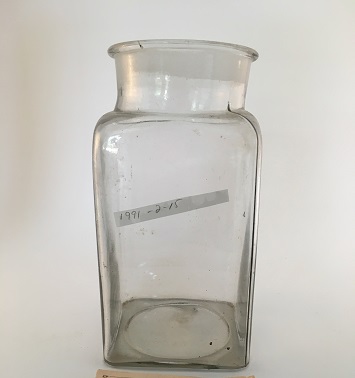 Description One Of Sixteen Glass Bottles Of Various Sizes, Colour And Shape. Jar Large Square Clear