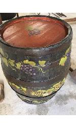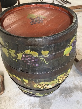 Description An old wine barrell recently painted with a grapes and leaf motif and the name ' Verla Delaforce' (Blue Lid).