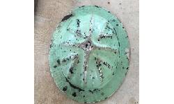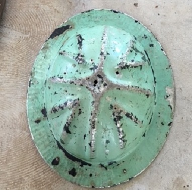 Object Desc Miner’s Hat. Aluminium, green, dented with holes