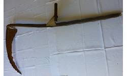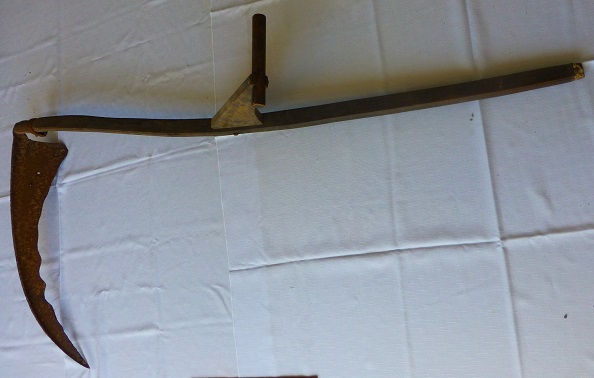 Description Scythe . Used at New Italy. Handles added by Barry's Dad or Grandfather?