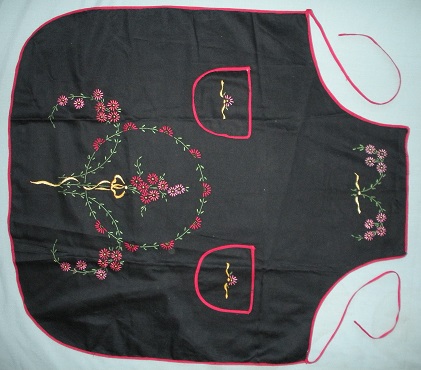 Description Black bib apron, trimmed with red bias binding, two small pockets, hand embroidered with red and pink daisies and yellow ribbons all over. Made by a student of the New Italy School for the Headmaster's wife, Ada Morgan, who was the sewing teacher.