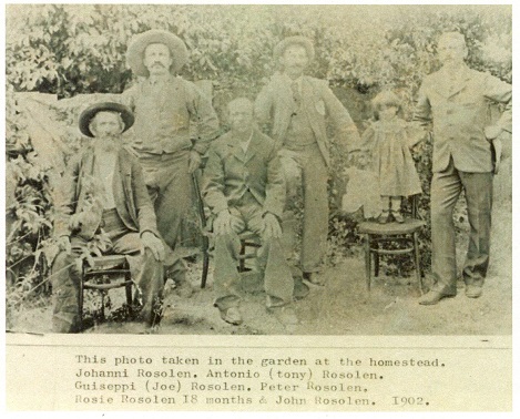 Description 1. Dominico ROSOLEN (with bicycle) 2. Dominico ROSOLEN snr (on horse) son Dominic, grand daughters Peggy and Ruth sons George and Walter. 3. Cream wagon built by the ROSOLENs around 1920. 4. Mrs Dominico ROSOLEN (holding reins) and Mrs Seymonds. 5. Domini