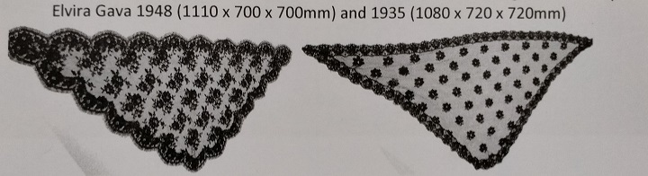 Notes 2 Mantillas, (Mantiglias Italian), Head coverings. Triangular black lace from Italy. 1080 x 720 x 720 mm 1935 and 1100 x 700 x 700 mm 1948. Used by Elivra GAVA
