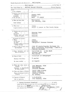 Description Death Certificate NSW No 3 1894 Angelo ZAIA 3 January 1894